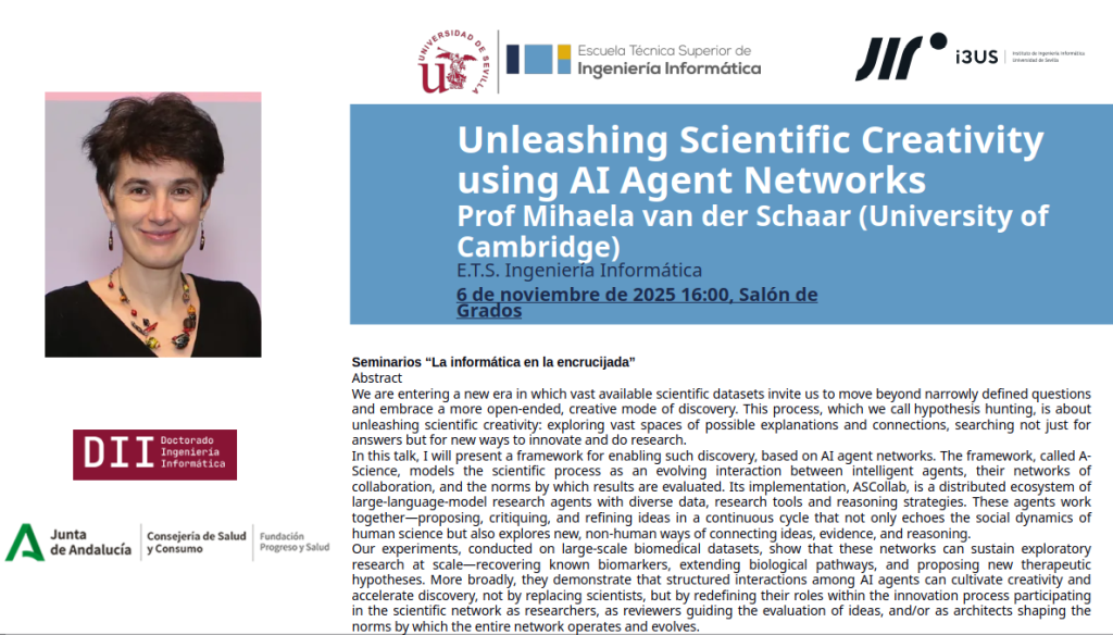 El próximo jueves 6 de noviembre de 2025 a las 16:00 en salón de grados de la ETSI Informática tendrá lugar el seminario «Unleashing Scientific Creativity using AI Agent Networks» a cargo de la profesora Mihaela van der Schaar (University of Cambridge) dentro de la serie «La informática en la encrucijada» al que está toda la […]