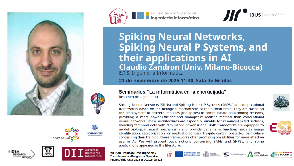 El próximo viernes 21 de noviembre de 2025 a las 11:30 en la sala de grados de la ETSI Informática tendrá lugar el seminario «Spiking Neural Networks, Spiking Neural P Systems, and their applications in AI» a cargo del profesor Claudio Zandron (Univ. Milano-Bicocca) dentro de la serie «La informática en la encrucijada» al que está toda la comunidad educativa invitada.